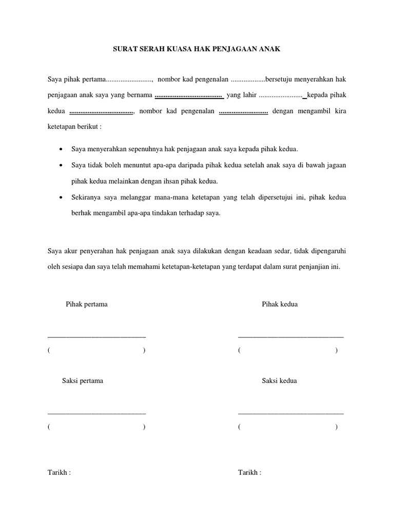 Contoh surat serah kuasa hak penjagaan anak. 15 contoh surat akuan sumpah kehilangan sijil lahir. Mengikut Seksyen 6 1 Akta Pendaftaran Pengangkatan 1952 Akta 253 anak angkat bermaksud.